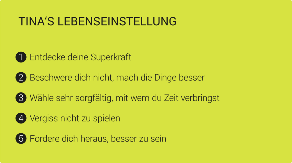 Im Vortrag erklärt Tina 5 persönliche Regeln, an die sie sich sowohl im privaten wie auch im geschäftlichen Umfeld hält. Die Ergebnisse widerspiegeln Werte, die Roth Eisenberg am Herzen liegen, vor allem die Möglichkeit das Leben anderer Menschen positiv zu beeinflussen. Ob es nun darum geht eine Konfettibox zu haben, den Zeitplan einzuhalten oder eine Umgebung zu schaffen, die Enthusiasmus kultiviert, Eisenberg drängt uns alle dazu, unseren Erfolg mit persönlichem Glück und Wachstum auszugleichen, unser eigenes und das der Menschen um uns herum. “Obwohl ich meine Arbeit liebe, ist meine Arbeit nicht ich”, sagt sie.