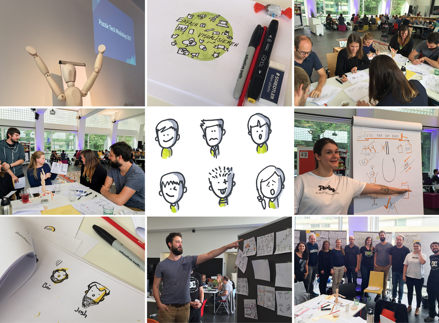 Am diesjährigen Puzzle Tech Workshop haben Jürgen und ich den Members von Puzzle ITC praktische Tipps und Tricks vermittelt, um ihre Ideen locker, lebendig und verständlich mitteilen zu können. In einem 3-stündigen Workshop haben sie Basistechniken der Visualisierung erlernt und direkt angewendet. Das Ergebnis lässt sich sehen und hat den einen oder anderen vom überzeugten “ich kann nicht zeichnen” zum überzeugten “hey ich kann ja doch zeichnen” konvertiert. Uns hat der Workshop grossen Spass gemacht und wir bedanken uns herzlich bei den allen Teilnehmenden!