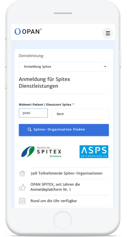 OPAN – eine Dienstleistung der Spitex, ermöglicht Spitälern, Institutionen und Arztpraxen, sowie Privatpersonen eine rasche Patienten-Anmeldung. Jährlich werden über 28’000 Anmeldungen von 370+ zuweisenden Stellen online getätigt.