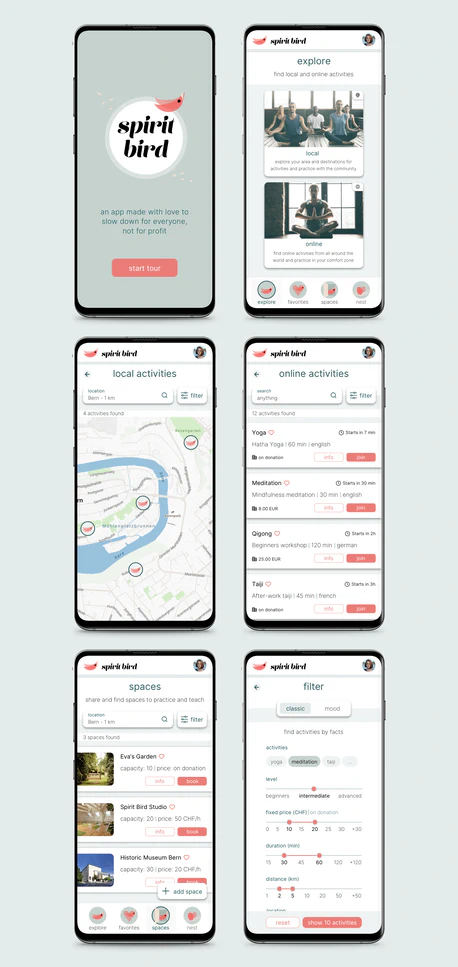 Spirit Bird ist eine Plattform für Naturliebhaber, für Menschen, die nicht gerne in Eile leben, für Menschen, die Wärme, Minimalismus und Ordnung schätzen. Sie bringt Neueinsteiger/Übende (Birds), Lehrer und Studios für Aktivitäten wie Yoga, Meditation, Qigong etc. zusammen. Reich und Arm sollen spenden-basiert einfachen Zugang dazu erhalten. Zudem wird das gemeinschaftliche Nutzen von Räumen für sinnvolle Zwecke gefördert.